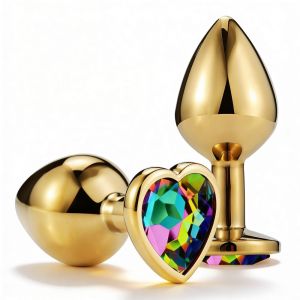 Анальна пробка ALUME, S, металева золотиста з різнокольоровим каменем у формі серця, 7 х 2,8 см