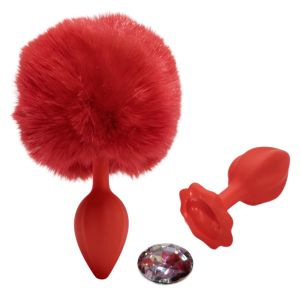 Анальна пробка рельєфна ALUME, S, червона з червоним пушком і змінним прозорим каменем, 7 х 2,8 см