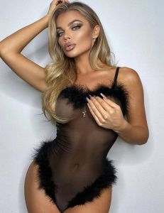 Особливістю моделі є оздоблення зі штучного лебединого пуху, яке прикрашає лінію декольте та ділянку стегон. Такий декоративний елемент створює атмосферу гламурної розкоші та робить образ більш яскравим і незабутнім. Регульовані бретелі дозволяють адаптувати боді під індивідуальні особливості фігури, забезпечуючи комфортну та впевнену посадку.