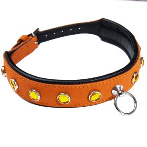 Ошейник со стразами тонкий DS Fetish кожаный, оранжевый (Голландия)