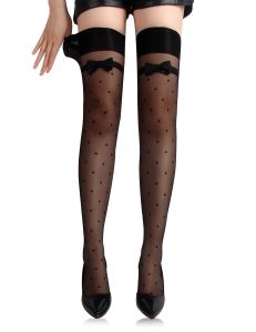 Черные чулки с изящным горошковым узором и большим декоративным бантом подчеркивают женственность и придают нотку игривости и чувственности.