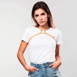 Тонкие ремешки из качественной экокожи перекрещиваются на спине и соединяются на груди с помощью металлического кольца, акцентируя внимание на зоне декольте. Бежевый цвет выглядит сдержанно и универсально, гармонично дополняя разные стили — от минимализма до более откровенных фетиш-образов.