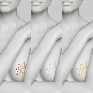 Металлический блеск красиво контрастирует с любым оттенком кожи, создавая эффект ювелирного украшения без аксессуаров. Тату легко наносятся, держатся на коже в среднем до 4 дней и при необходимости быстро удаляются средством для снятия макияжа.